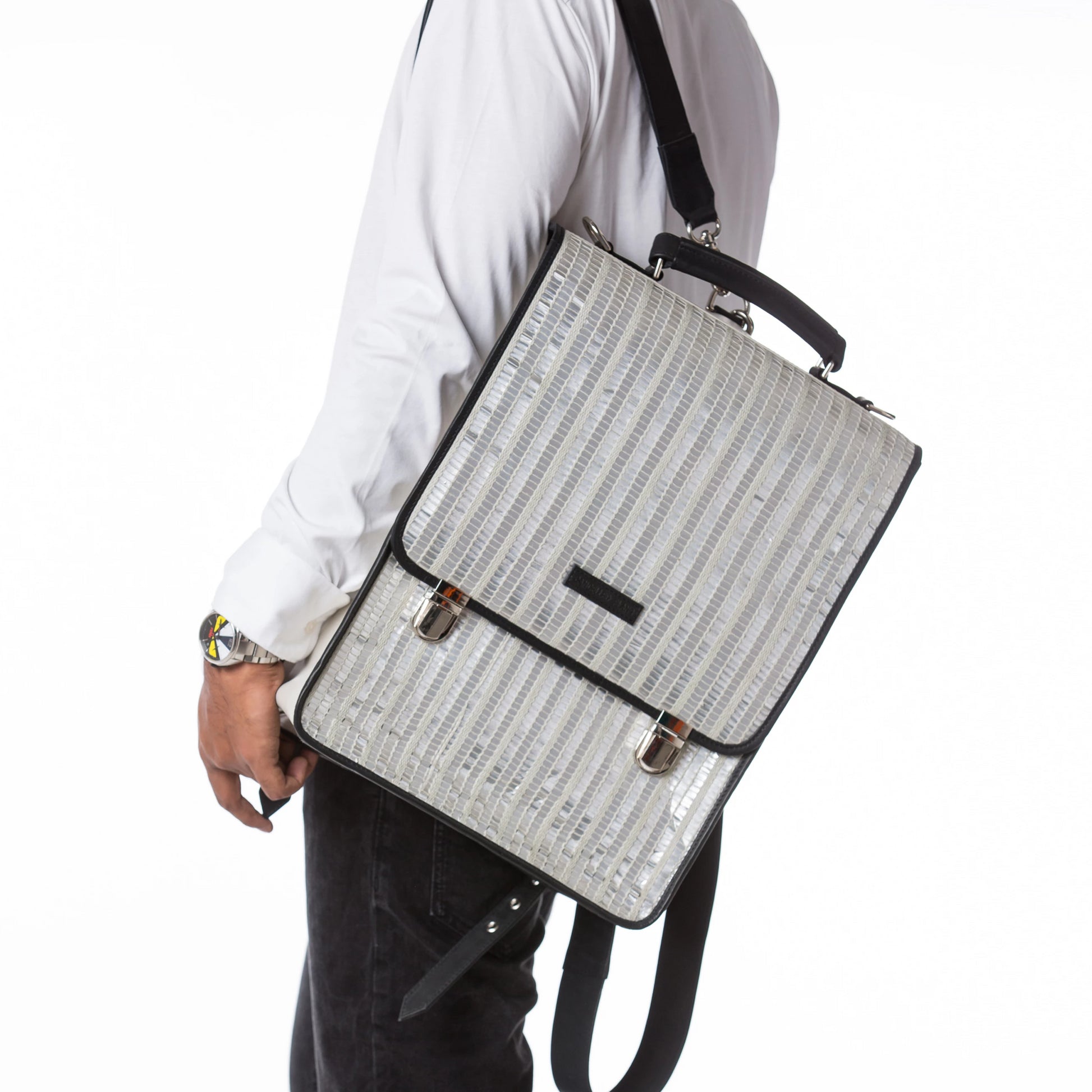 We collect pharmaceutical packaging waste and work with local weavers who develop our own handloom textile - Alu. We then work with leather artisans to source high quality leather and then put together this premium bag.