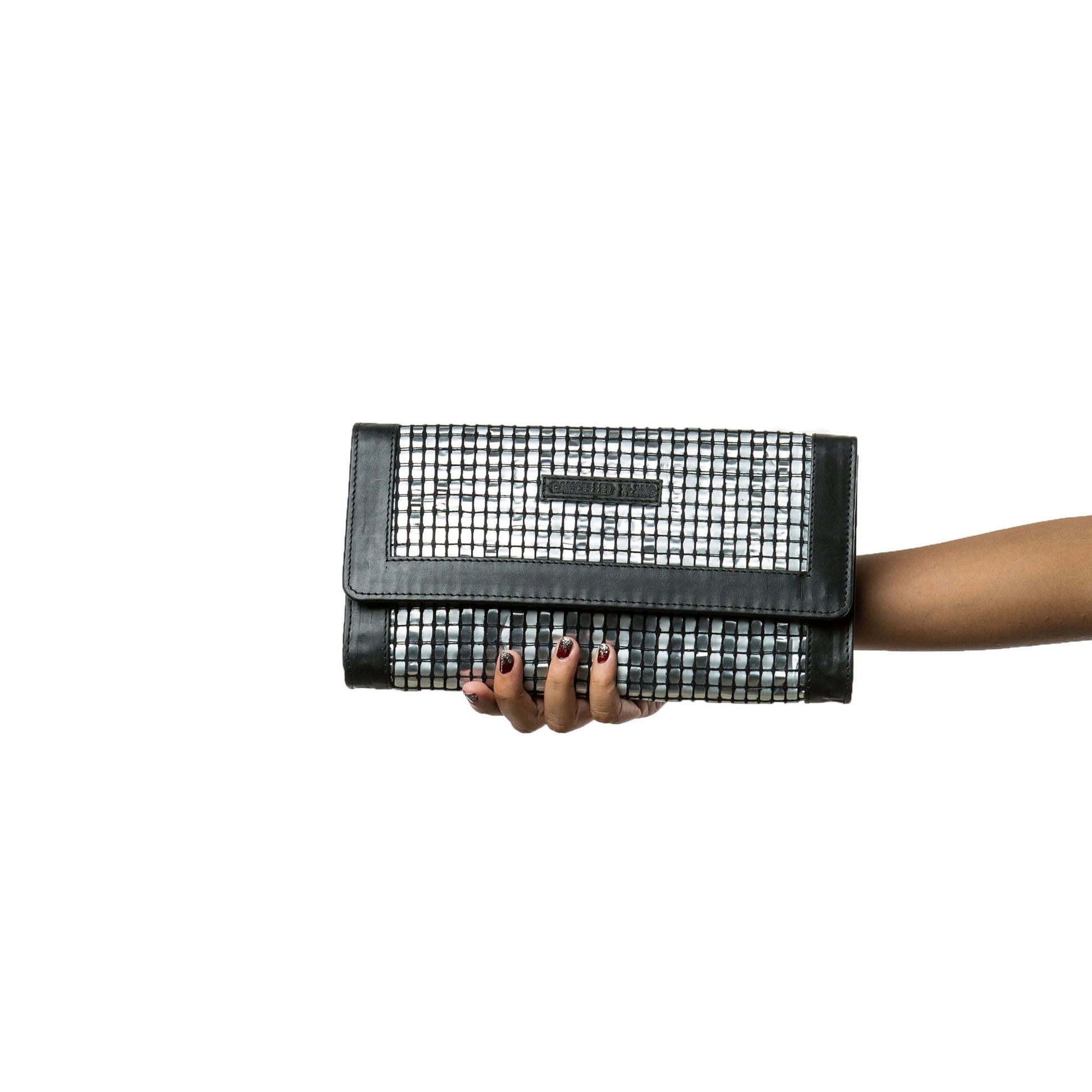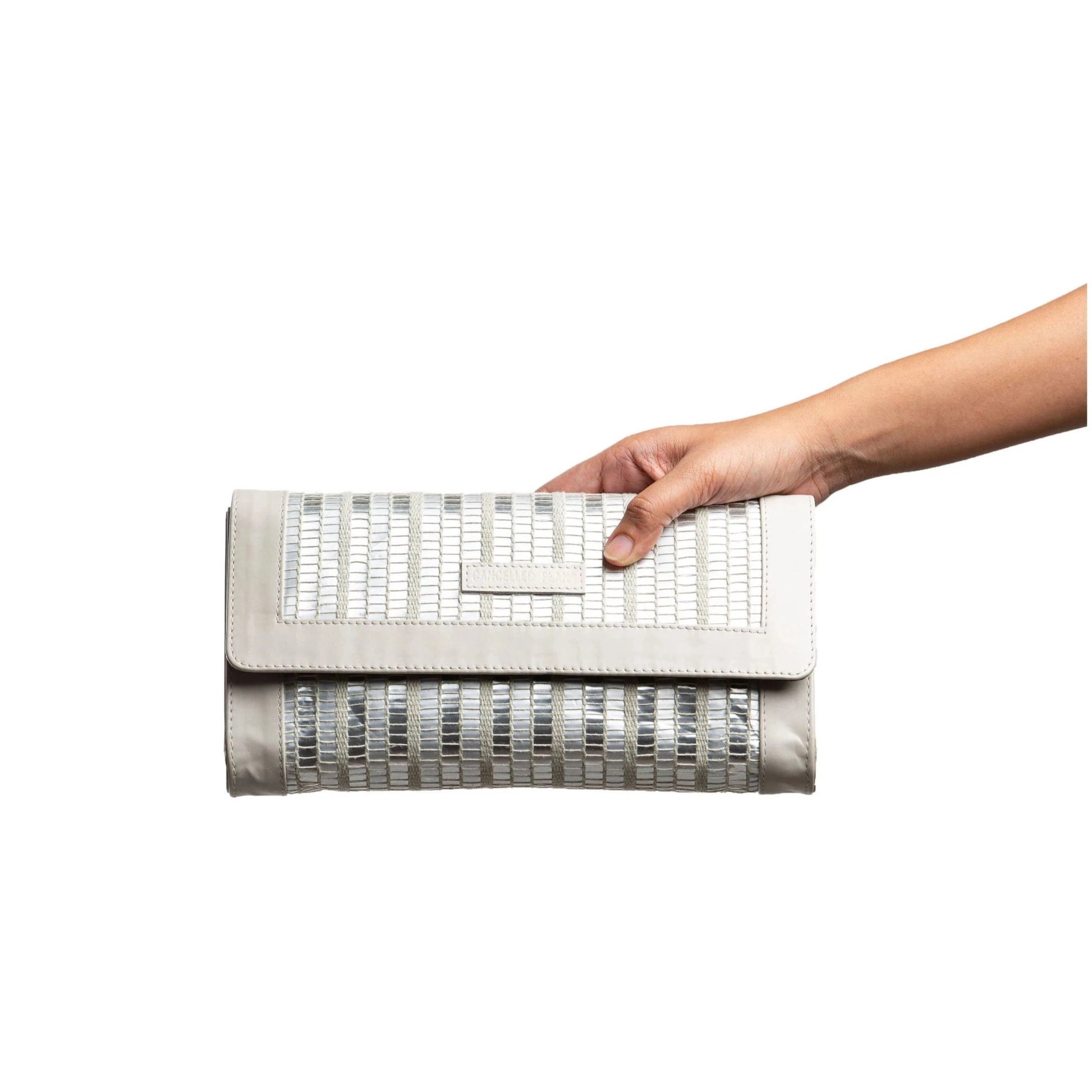 We collect pharmaceutical packaging waste and work with local weavers who develop our own handloom textile - Alu. We then work with leather artisans to source high quality leather and then put together this premium bag.