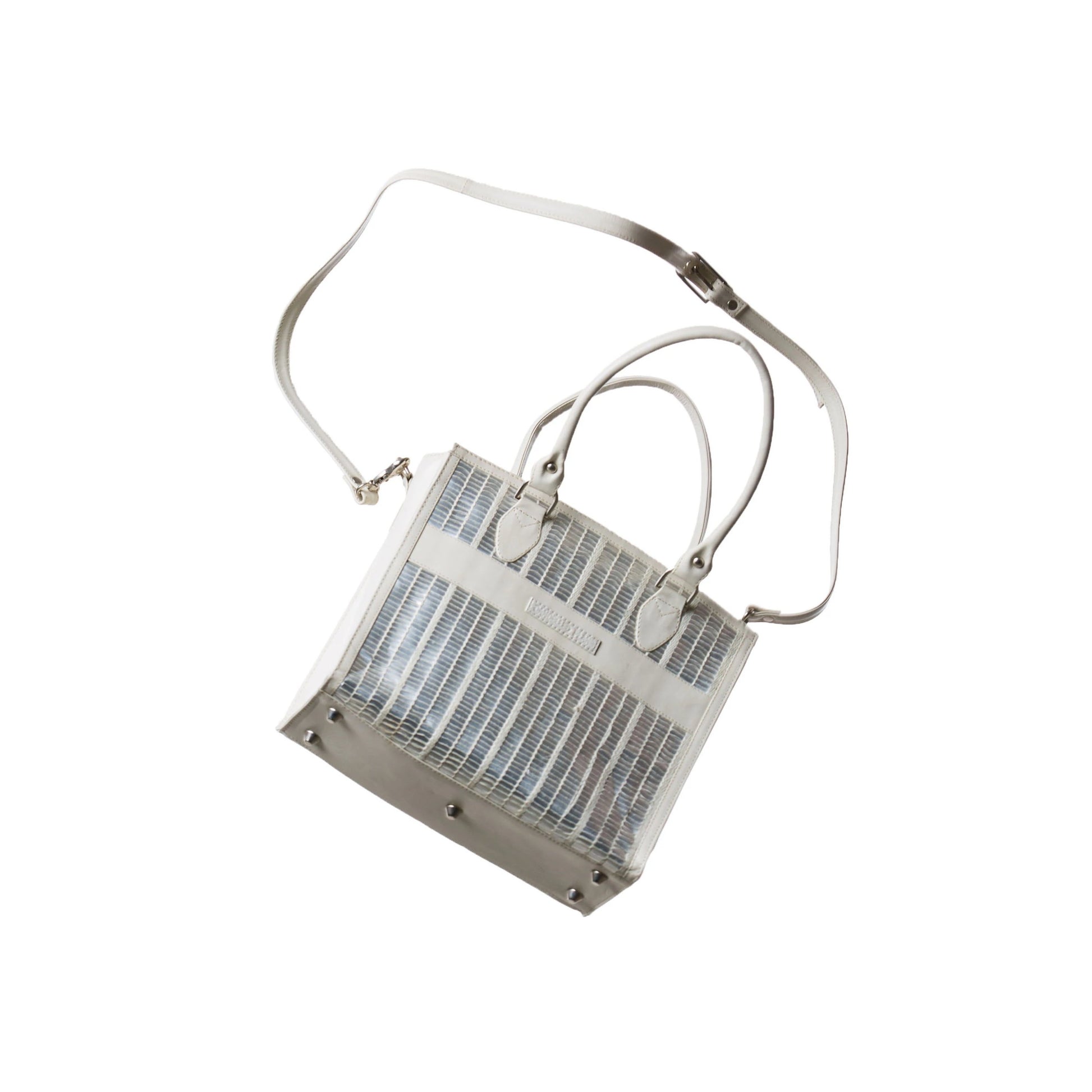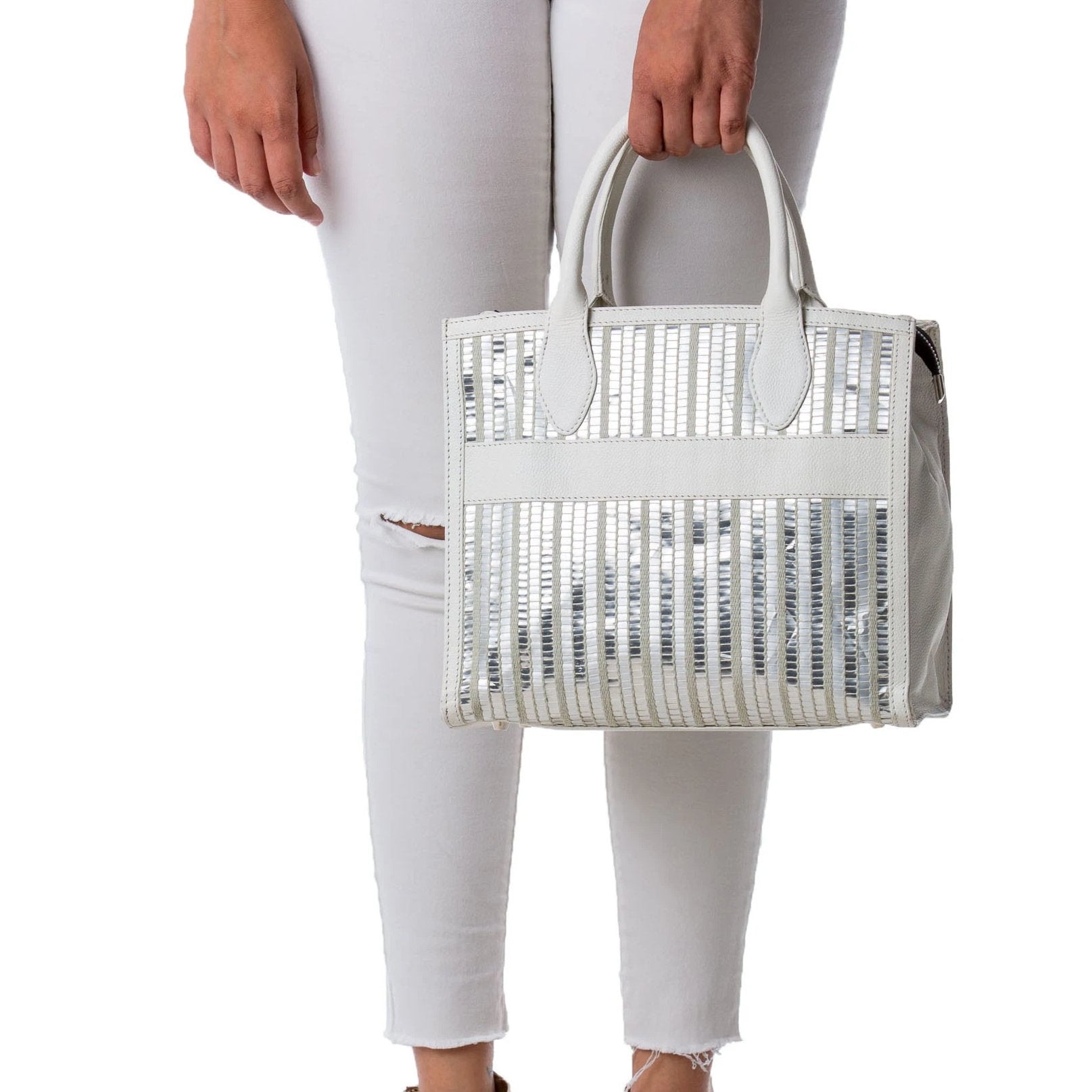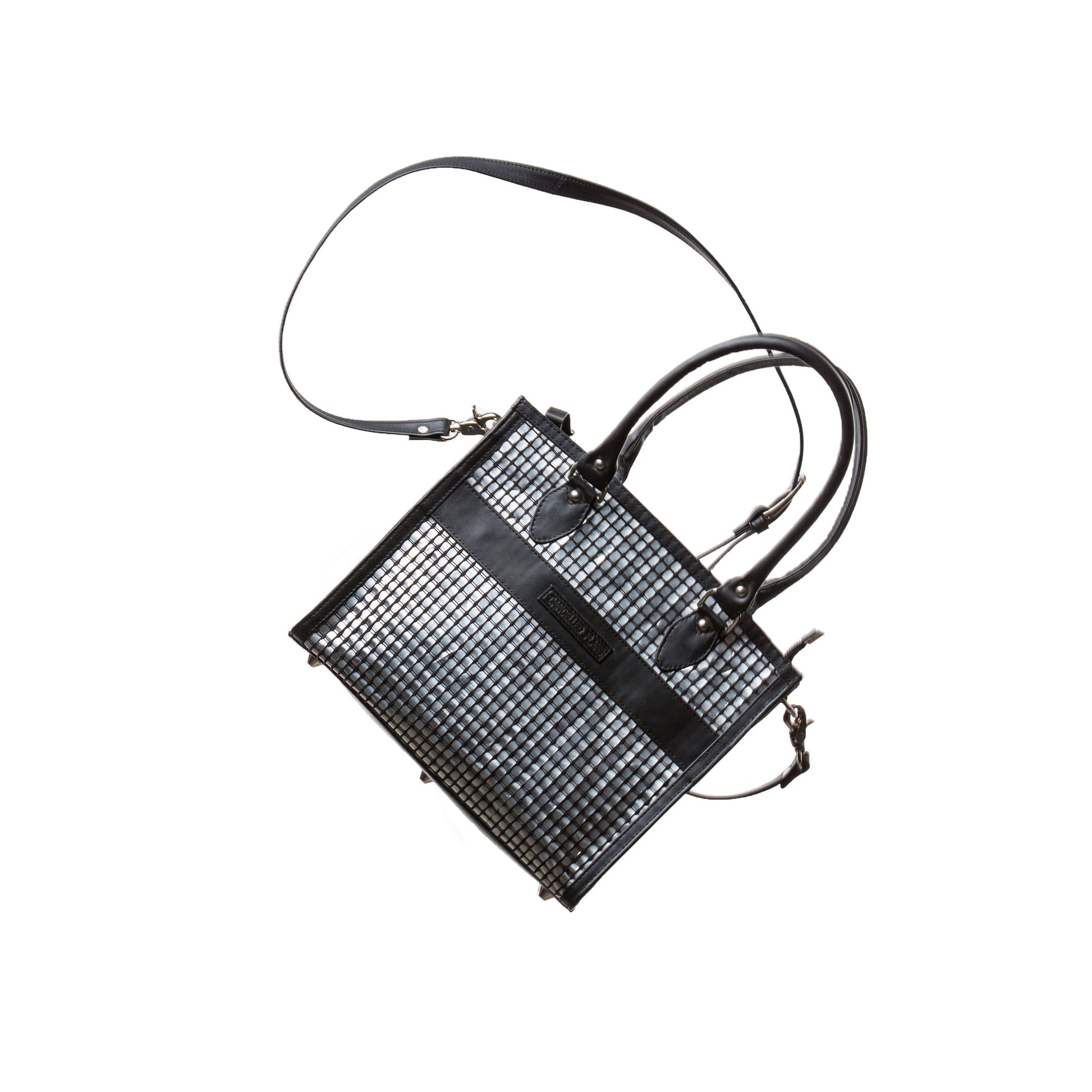 We collect pharmaceutical packaging waste and work with local weavers who develop our own handloom textile - Alu. We then work with leather artisans to source high quality leather and then put together this premium bag.