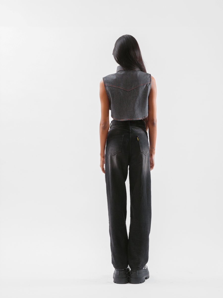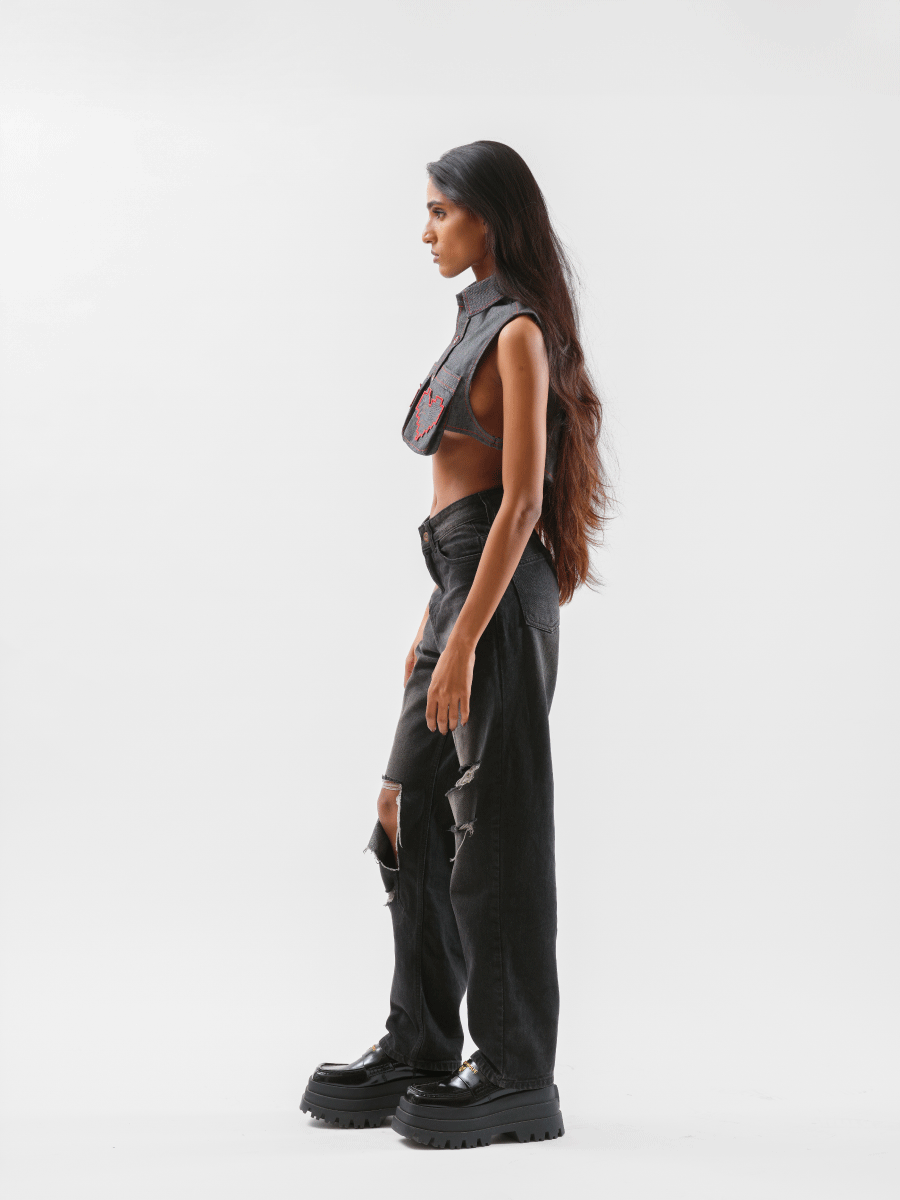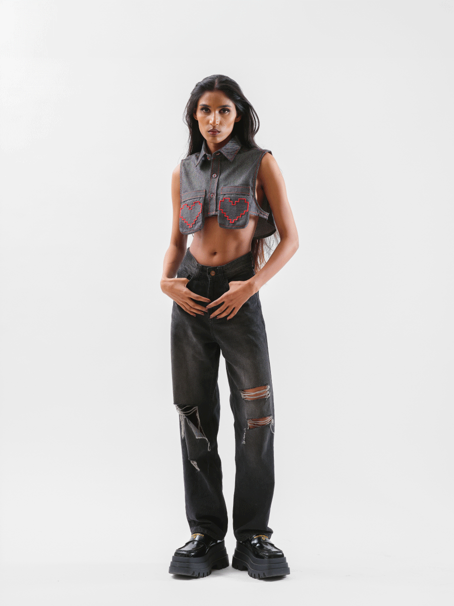 The Can’t Buy Me Love crop top is made from 100% premium-quality raw denim, ensuring durability, sustainability, and timeless style.