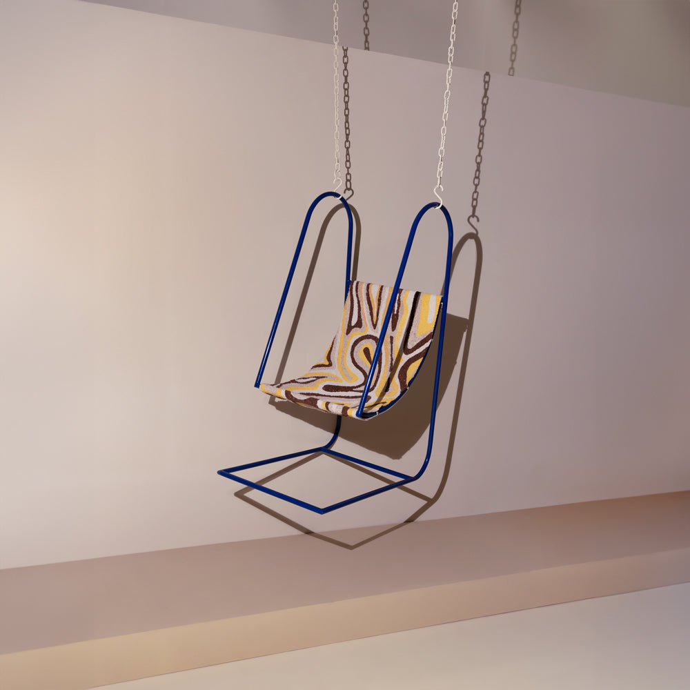 Inspired by Indian utilitarian furniture, the Trapeze Swing Chair is a union of form between the traditional hammock and rocking chair. The chair is defined by clean, fluid lines that are reminiscent of line doodles drawn in a flurry. The integrity of the chair is further enhanced by the woven waste fabric upholstery and hand-painted lead-free paint. A feat of balance that grounds any room, the Trapeze chair sits perfectly with the Daera x Cancelled Plans collaboration.